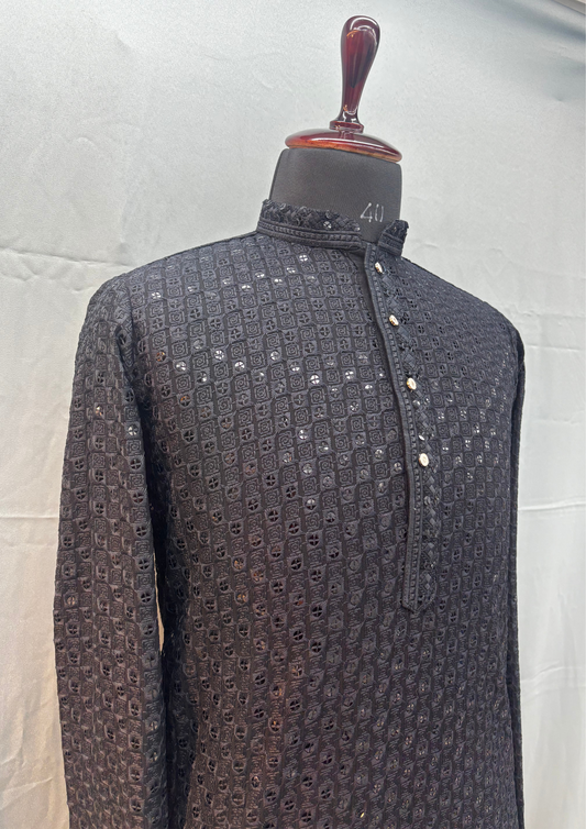 Black Lakhnavi Kurta Set for Men - Reyon Kurta JEW4